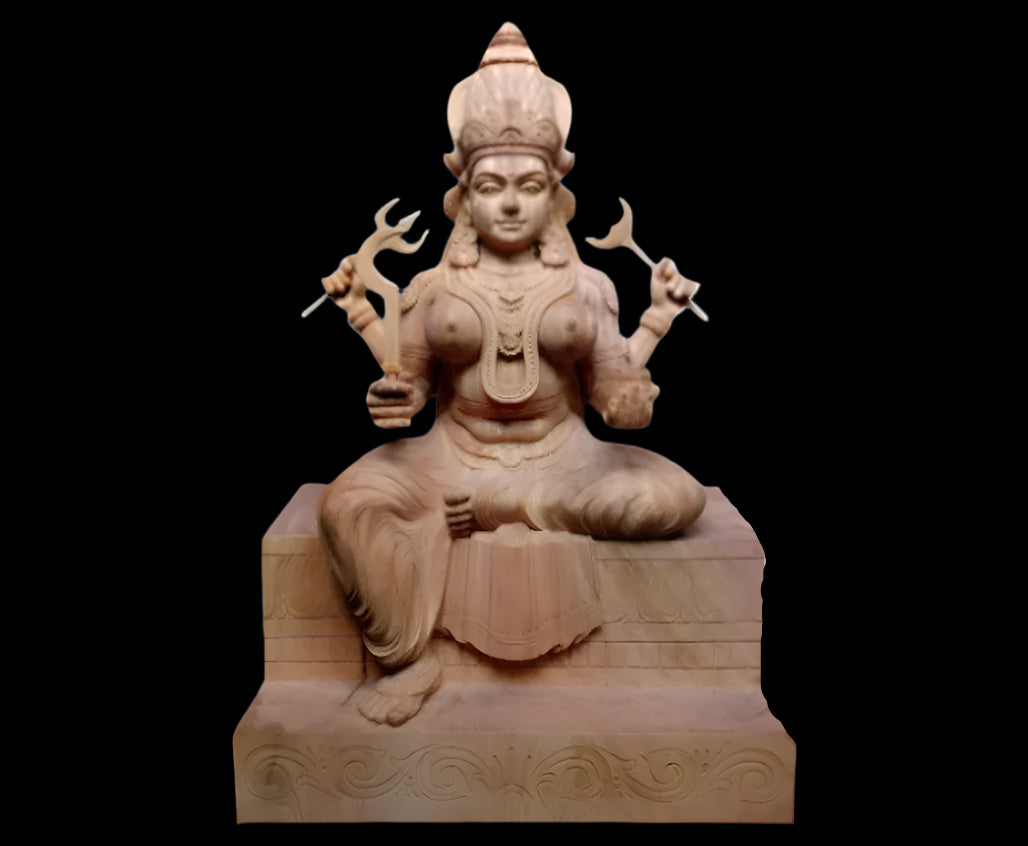 Carefully crafted, this exquisite idol of an Indian Goddess is sculpted on soft wood by our expert artisans. Completely handmade, it is designed for installation in Indian temples, reflecting divine beauty and spiritual significance. Every minute detail has been meticulously carved, showcasing the dedication and craftsmanship that bring this sacred masterpiece to life.